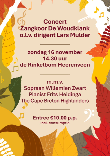 Tijdens dit concert werkt het koor samen met sopraan Willemien Zwart, pianist Frits Heidinga en The Cape Breton Highlanders. Het belooft een afwisselend muzikaal programma te worden, waarin koormuziek, solozang en instrumentale klanken elkaar versterken.