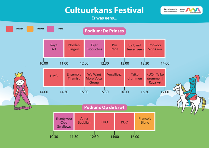 Deze editie hebben we maar liefst twee podia boordevol optredens. Geniet van muziek en dans van onder andere: Raya Art, Norden Singers, We Want More Vocal Group, Pro Rege, Bigband Heerenveen, Popkoor Sing4You, HMC, Ensemble Tiramisu, Eijer Producties, Vocalliezz, Taiko Drummen, Kuo, Shantykoor Odd Swallows, Anna Badalian en François Blanc.