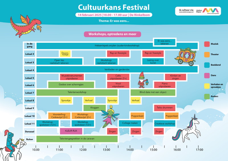 Op 14 februari 2026 bruist De Rinkelbom weer van cultuur tijdens dit kleurrijke én gratis festival! Bij het Cultuurkans Festival krijgt heel Heerenveen de kans om te culturen. Je kunt tijdens het festival ontdekken wat jij leuk vindt om te doen. Ga je dansen, schilderen, muziek maken of iets anders? Het kan allemaal! Het thema dit keer is Er was eens…